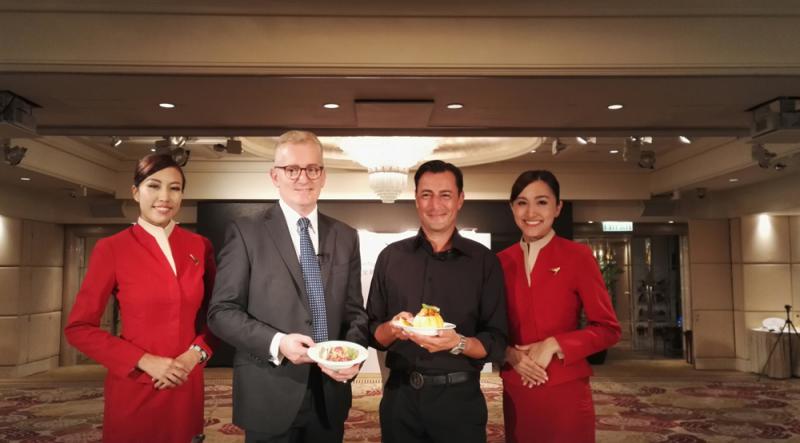 圖:國泰航空餐務部主管卡斯頓(左二)及國際名廚Daniel Green(左三)昨日展示此次新推出的機上餐膳/大公報實習記者姚宇欣攝