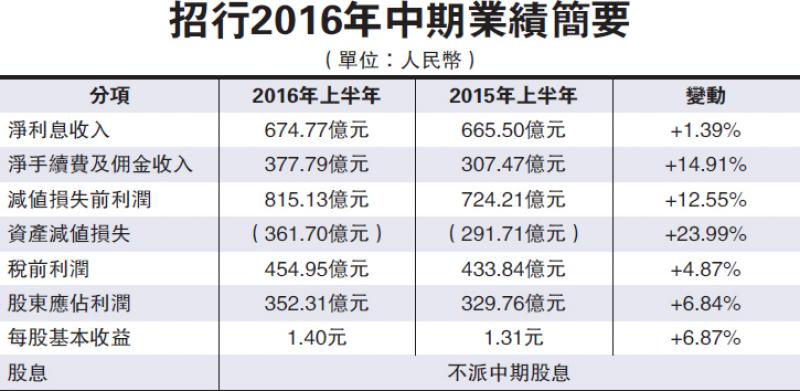 招行今年上半年錄得股東淨利潤352.31億元,同比增長6.84%;實現淨利息收入674.77億元,同比增長1.39%;實現非利息淨收入459.17億元,同比增長21.37%。期內,由於2015年內降息影響隨資產負債重定價集中釋放,招行上半年淨利差為2.45%,同比下降15個基點;淨利息收益率為2.58%,同比下降20個基點,較首季的2.49%及2.62%亦進一步收窄。