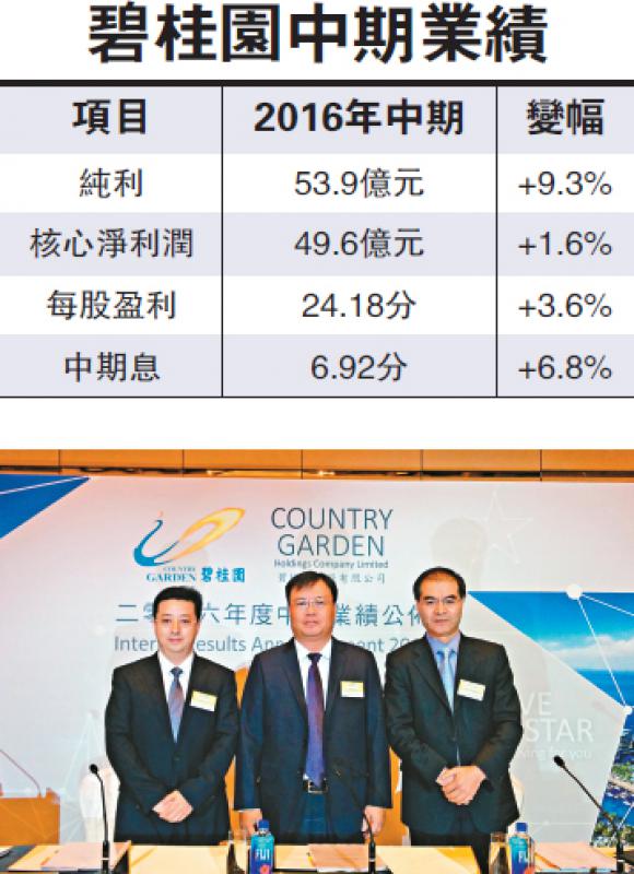 【大公報訊】碧桂園(02007)中期多賺9.3%至53.9億元(人民幣,下同),但核心淨利潤僅升1.6%至49.6億元,上半年毛利率亦按年減少2.2個百分點至約21%。截至期末,公司借貸比率約62.6%,公司目標維持借貸比率於70%以下,並將目前約5.7%的融資成本,進一步下降至5%以下。