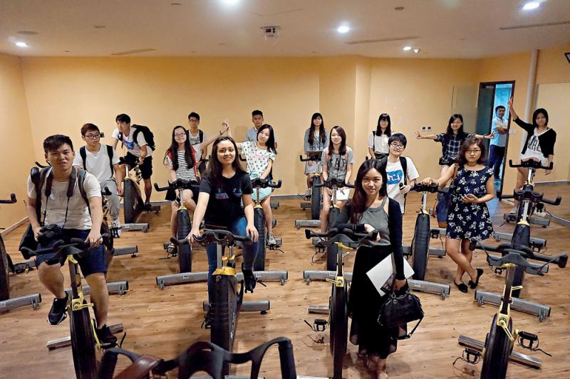 圖:香港傳媒學子在北京維景國際大酒店健身房合影 大公報記者林靜文攝