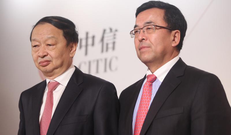 圖:中信董事長常振明(左)表示,期望未來五至十年,把非金融業務的利潤貢獻由現時僅15%提升至40%水平,旁為中信副董事長兼總經理王炯 大公報記者麥潤田攝