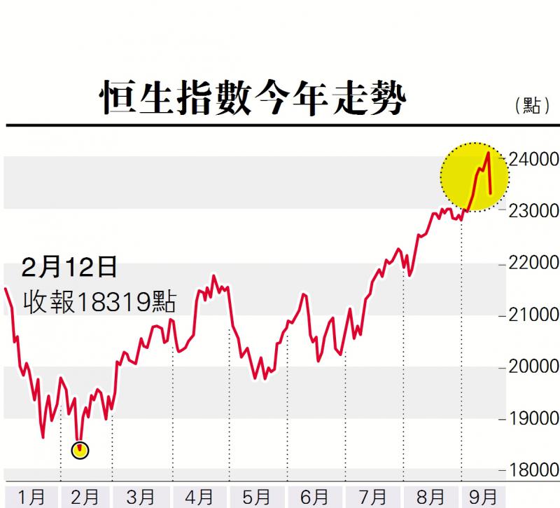 美股上周急瀉觸發骨牌效應,亞太區股市周一開市已全線向下,日股跌1.7%,韓股跌2.2%;今年表現落後的馬來西亞股市跌0.3%。港股方面,恒指昨日低開低走,大幅跑輸亞太區內其他市場。恒指以全日低位23290點收市,顯著回吐809點,創去年8月中旬以來最大單日點數跌幅。國企指數跌403點,跌幅更達到4%。早前在高位跟風買入的投資者,昨日不計價拋售持股,全日下跌股份1554隻,上升股份只佔181隻。港股市值跌穿26萬億水平,蒸發8269億元,至25.5萬億元。港股恐慌指數大升21.9%至20.12點,創近兩個月新高。