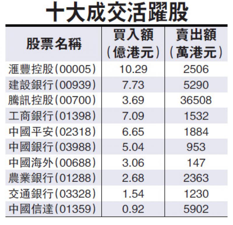 【大公報訊】休戰三個交易日後,港股通昨日節後首日繼續高朋滿座,買入金額多達75.95億元,以港股主板全日成交額725億元,港股通交投佔比達10.4%。金融股仍然是最多資金流入的板塊股份,其間流入滙豐控股(00005)的金額達到10.29億元,佔滙控全日成交比重45%,難怪坊間近日戲稱滙控染紅。建行(00939)、工行(01398)、中國平安(02318)北水資金流入分別達7.73億元、7.09億元及6.65億元。