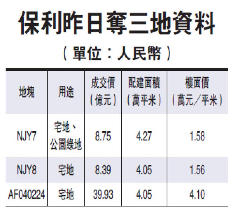 昨日出讓的八地分布在白雲、番禺、南沙及荔灣區。保利共奪三地可說是當日的大贏家,取得南沙黃閣鎮蕉門兩地塊均突破周二拍出的樓面價紀錄。