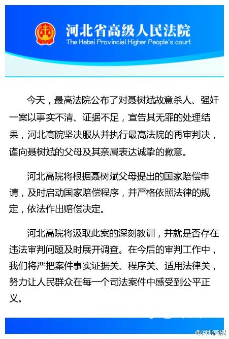 河北高院將汲取此案的深刻教訓,並就是否存在違法審判問題及時展開調查,在今後的審判工作中,我們將嚴把案件事實證據關、程序關、適用法律關,努力讓人民群眾在每一個司法案件中感受到公平正義。