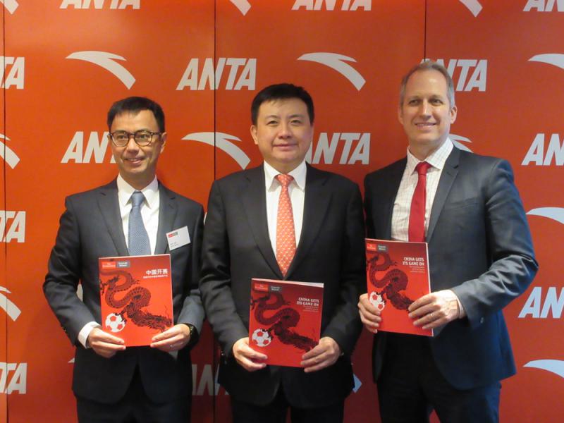 圖左起為安踏體育首席財務官兼公司秘書林戰、安踏品牌總裁鄭捷、經濟學人企業網絡組織北京和香港兩地機構負責人Rob Koepp/大公報記者李潔儀攝