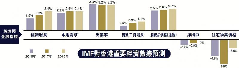 IMF報告指出,今年香港仍然會面對外圍環境挑戰,包括美國進入加息周期,全球貿易增長呆滯及內地經濟重新平衡,將導致香港經濟增長步伐較慢。但隨着全球經濟復甦,中期經濟增長預計會回升至約3.5%。長遠而言,香港會面對人口老化削弱結構性財政狀況,因此當局有需要作出財政規劃以緩減跌幅,並處理房屋供應短缺的問題。