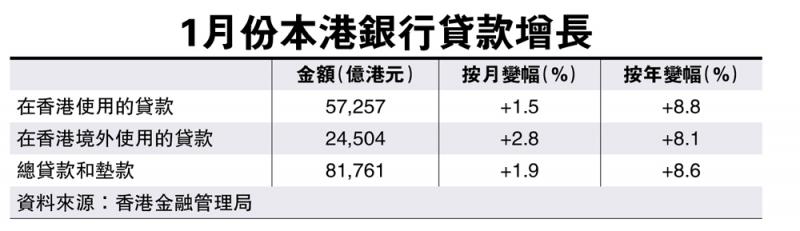 儘管1月份貸款增速是最近19個月來最快,上述銀行界人士形容只是回復正常增長,「未見顯著上升」。貸款增長動力方面,中資企業近期在香港投資有加快跡象,他說「無論是買樓、投地、買Office」,中資企業都有貸款需求,大部分都是在香港市場融資。