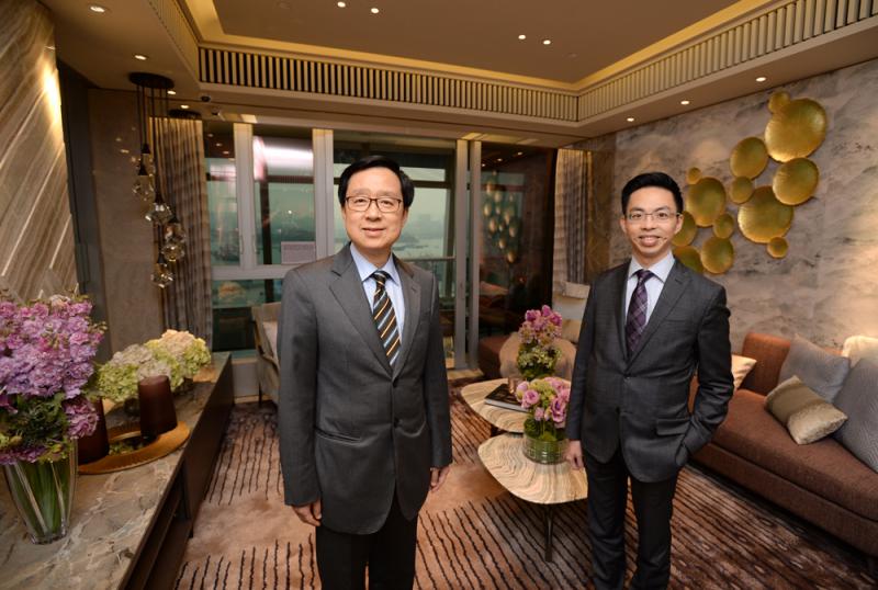 圖:雷霆(左)稱匯璽向南望海四房雙套大戶供應僅得四十伙,極度罕有。旁為陳漢麟/大公報記者林良堅攝