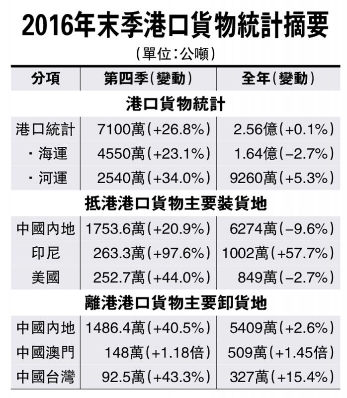 在抵港貨物的主要裝貨地區,去年第四季度,內地貨物吞吐量按年增長20.9%至1753.6萬公噸,惟全年貨物吞吐量按年跌9.6%至6274.1萬公噸。台灣、新加坡、印度尼西亞、美國、韓國、泰國和越南,上季抵港貨物吞吐量均按年錄得雙位數增長;日本則錄得跌幅。