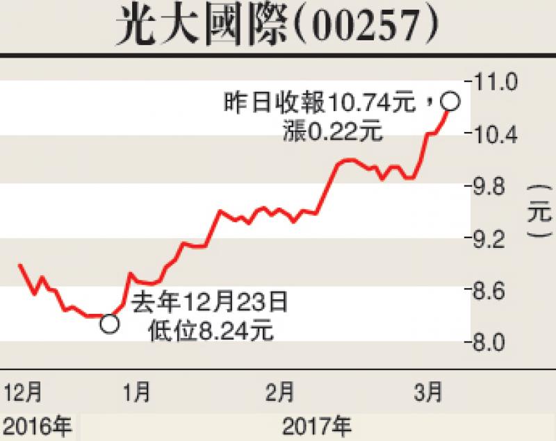 大市調整,短線不妨吼一些受惠政策而表現較強的股份,防守性較高。全國兩會期間,國務院總理李克強工作報告指出,針對內地污染問題日益嚴重,要對二氧化碳及氮氧化物減少3%排放,環保股份料可持續受惠,其中行業龍頭中國光大國際(00257)股價呈突破趨勢,不妨順勢追入。集團早前公布截至2016年底全年業績,收入增長63.8%至139.71億元,純利增長33.6%至27.85億元,表現搶眼。