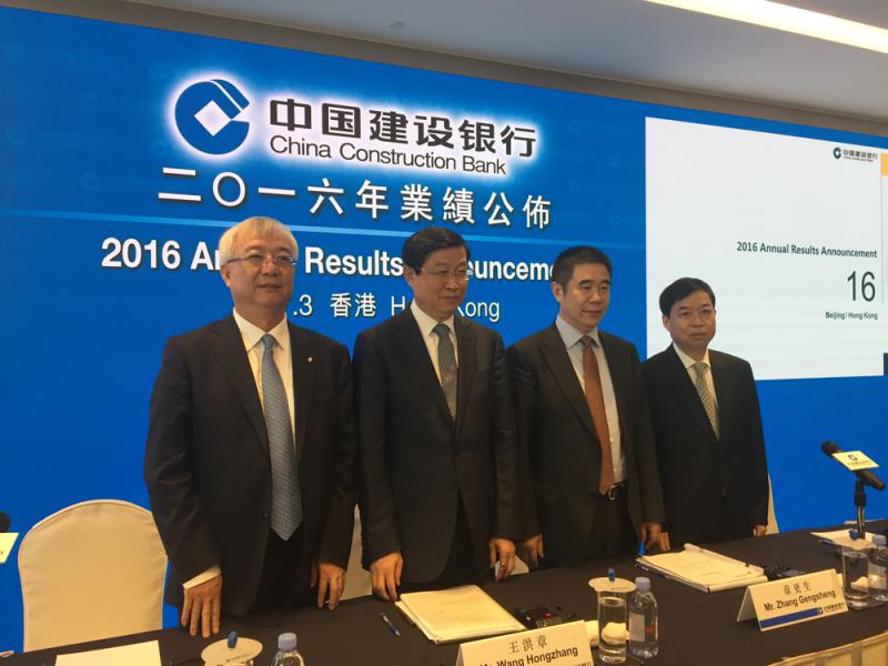 圖:(左起)建行首席經濟學家黃志凌,董事長王洪章,副行長章更生,董事會秘書陳彩虹 大公報攝