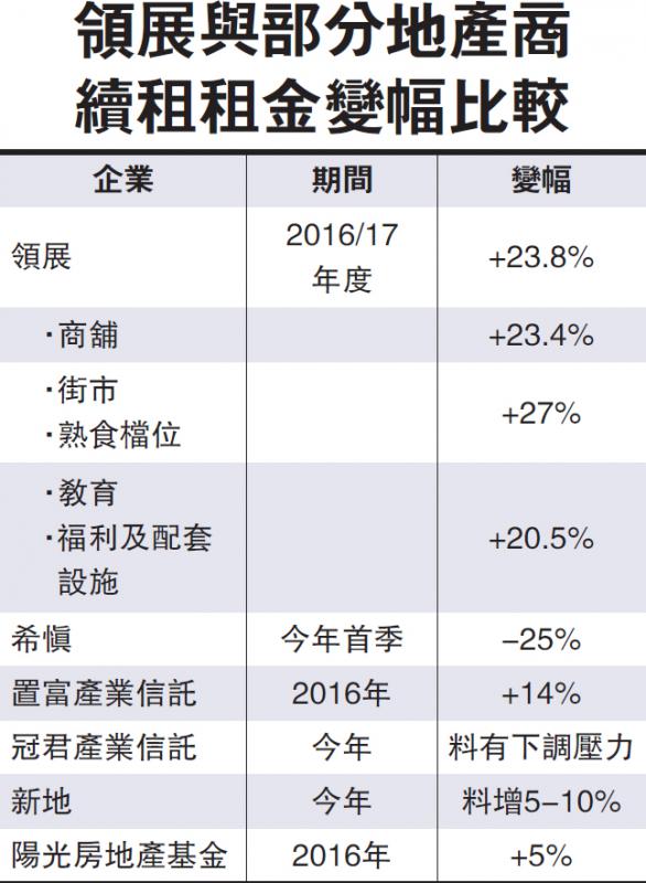 民建聯立法會議員柯創盛表示,有租用領展街市檔位經營花店的商戶向他反映,領展將其現時每月7000元的租金,加至10000元,升幅達43%。亦有租用街市附屬舖位的糖水店老闆稱,其299呎舖位租金由3萬元增至4.26萬元,一致批評租金升幅「離譜」。
