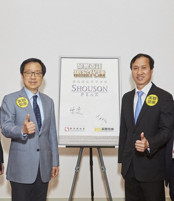 新地副董事總經理雷霆(左)與布少明剛簽訂SHOUSON PEAK獨家代理委託