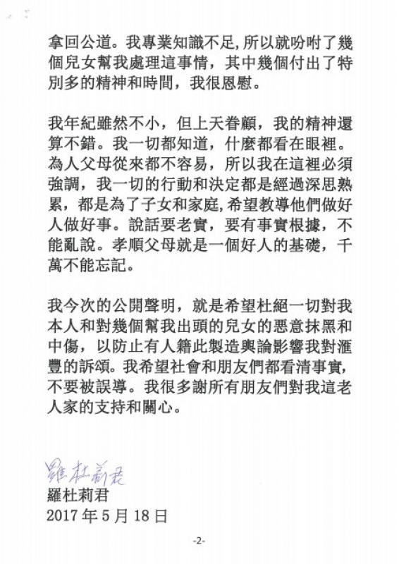 我今次的公開聲明,就是希望杜絕一切對我本人和對幾個幫我出頭的兒女的惡意抹黑和中傷,以防止有人藉此製造輿論影響我對滙豐的訴頌。我希望社會和朋友們都看清事實,不要被誤導。我很多謝所有朋友們對我這老人家的支持和關心。