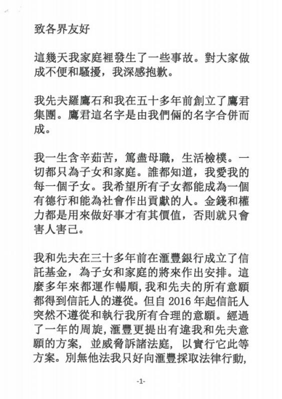 大公網6月14日訊(記者趙建強)鷹君(00041)羅鷹石遺孀羅杜莉君(羅老太)入稟要求撤換家族基金信託人滙豐事件,羅家孻子羅啟瑞公關向傳媒發出一封署名羅杜莉君,並有其簽名,但日期為5月18日的公開信。羅啟瑞方稱因公開信於5月18日寫好後有一些事而暫緩發布,但沒有解釋為何於今日發出。