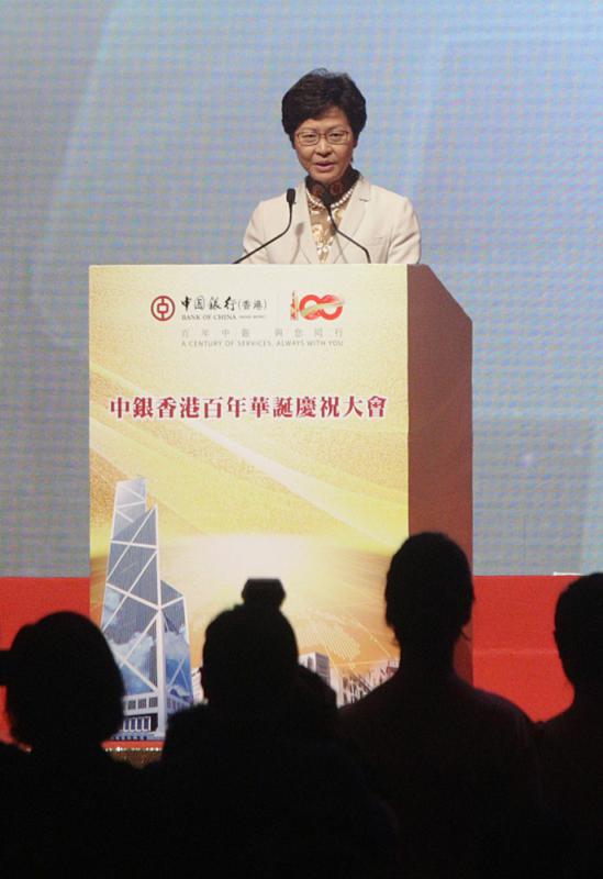 林鄭月娥在「中銀香港百年華誕慶祝大會」上致辭說,隨着國家推動「一帶一路」建設,世界各地與香港及內地的金融聯繫將會不斷加強。香港銀行業可以為企業在「一帶一路」的項目提供投融資、資產管理、風險管理等多方面的服務,並充分利用香港的平台,支援內地企業「走出去」,鞏固香港作為國際金融中心的地位。