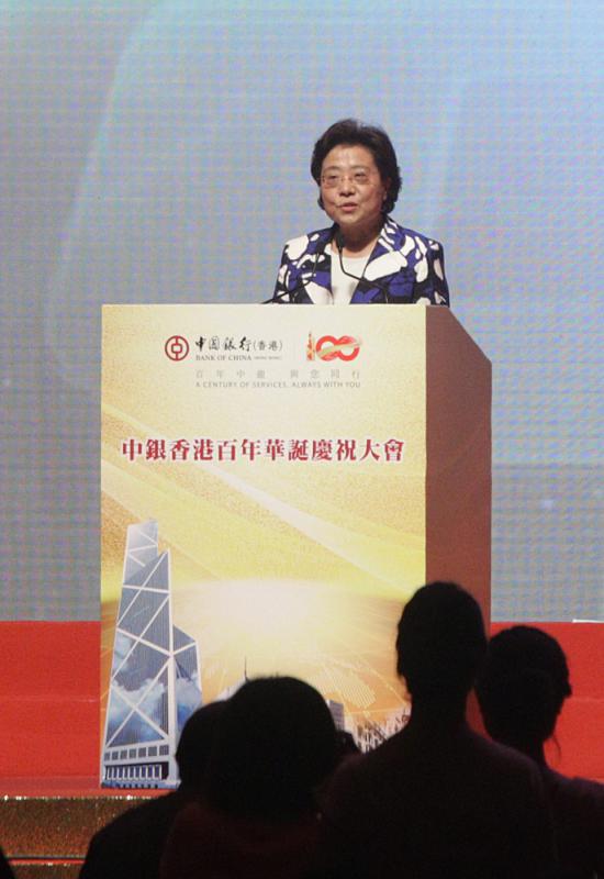 她續說,保持香港長期繁榮穩定,推進「一國兩制」在香港的成功實踐,已成為「中國夢」的重要組成部分,冀包括中銀香港在內的廣大中資企業與香港各界一道,「勇於擔當,不辱使命,迎難而上,開拓創新」,再創香港發展新輝煌。