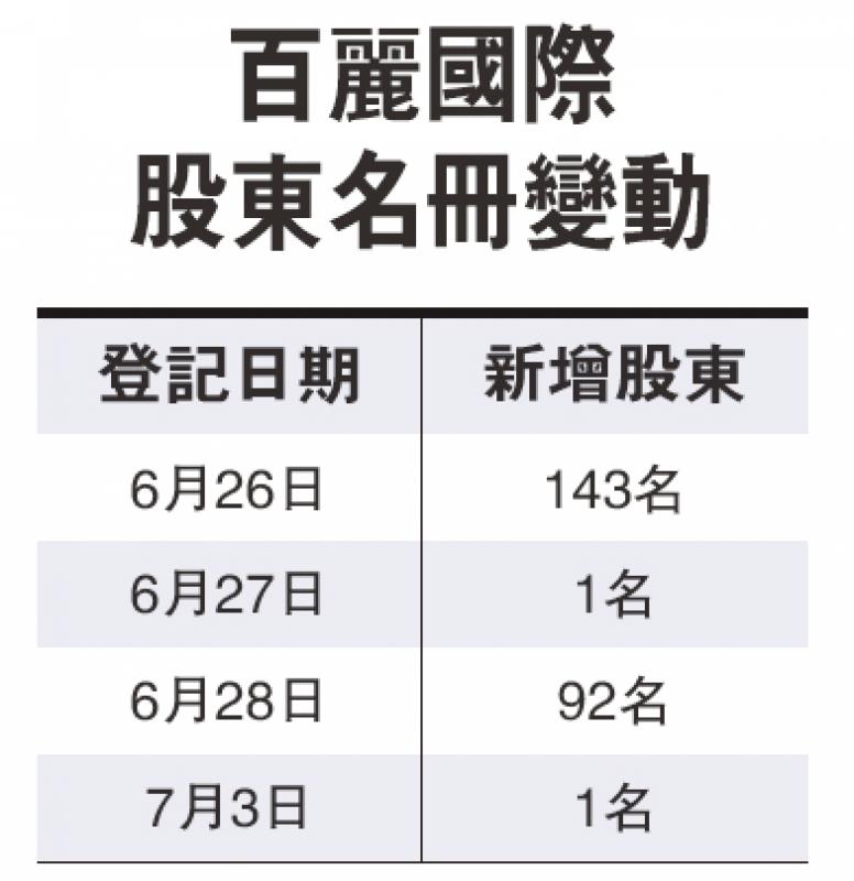 香港傳媒Now新聞發現,自上周起從過戶處取得百麗國際的股東名冊發現,突然新增了237名股東,而大部分都是集中在6月26日及28日登記,當中有最少234個股東只持有一手,即1000股股份,而且絕大多數的新增股東名字為普通話拼音,登記地址在深圳,更有最少38人以百麗位於深圳及香港總部的大廈作為登記地址。