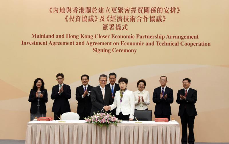 2003年內地與香港簽署CEPA協議。十多年來,兩地簽署10份補充協議及香港與廣東基本實現服務貿易自由化協議、香港與內地服務貿易協議,此次又簽署了兩份新協議,進一步完善了CEPA制度性合作安排,促進貨物貿易及服務貿易自由化、投資便利化。