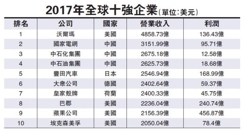 【大公報訊】記者李潔儀報道:《財富》全球500強中,沃爾瑪(Walmart)連續四年蟬聯榜首。「股神」巴菲特的投資旗艦巴郡(Berkshire Hathaway)更首次打入十強。