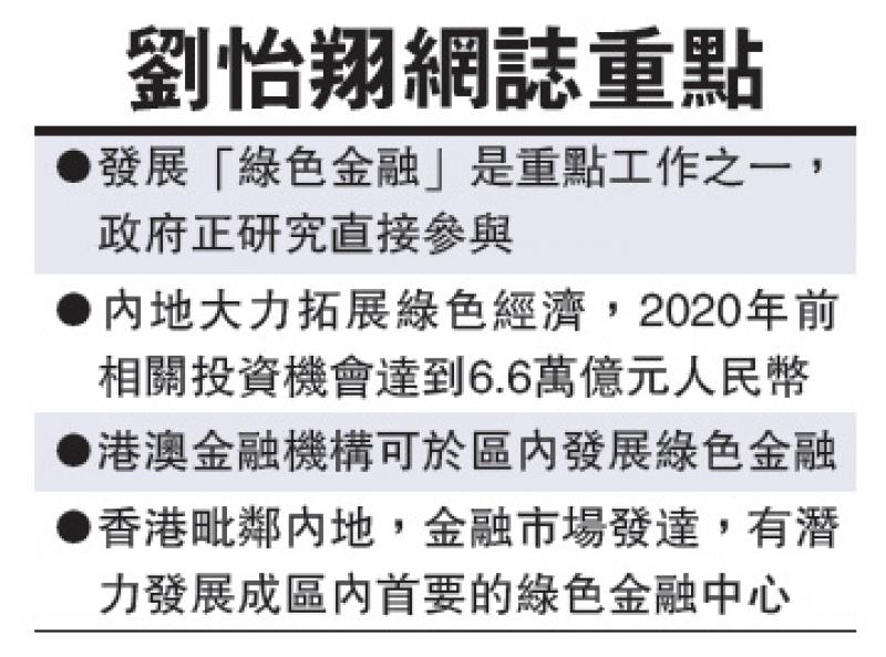 綠色金融近年在中國內地蓬勃發展,內行去年發表報告指出,在2020年前,中國城市在低碳建築、綠色交通、清潔能源方面預計有6.6萬億元人民幣的投資機會,然而政府財政只能滿足10至15%的投資需求,因此必須引進新的綠色資本去彌補缺口。劉怡翔表示,內地去年初啟動綠色債券市場,2016全年境內外發行量達2300億元人民幣,成為全球之首,預料未來發展前景仍然廣闊。