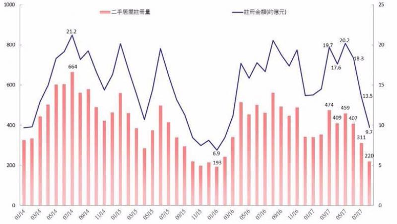 香港置業行政總裁李志成表示,受新一期居屋影響,二手居屋交投變得疏落。據土地註冊處資料顯示,本月截至8月23日,只錄220宗二手居屋註冊,較7月同期的230宗下跌約4.3%;涉及註冊金額約9.71億元,較7月同期約10.03億元下跌約3.2%。李志成估計,今月全月二手居屋註冊量將挨近300宗邊沿。