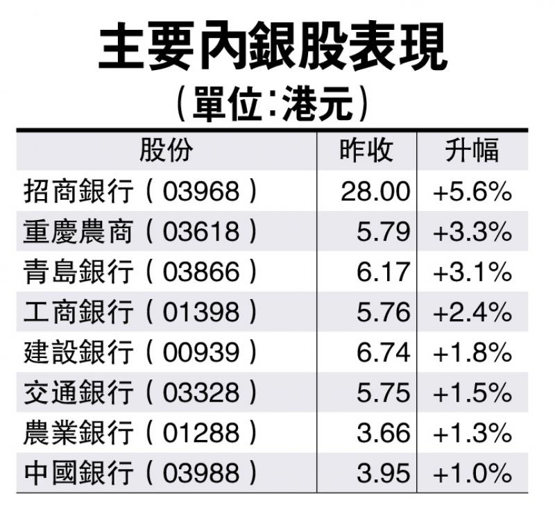 滙控(00005)股價升勢不再,騰訊(00700)、友邦保險(01299)亦陷入區間上落悶局。港股焦點集中在內銀股,三大藍籌內銀股昨日股價升幅皆超過1%,其間以工行最強,股價升2.5%,報5.76元,見兩年高位;建行股價同樣見兩年新高,升1.8%,報6.74元。中行(03988)亦不弱,升1%,報3.95元。三隻內銀股合共貢獻恒指83點升幅。
