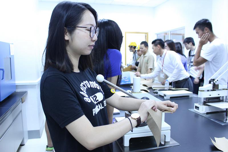 學子們發現,有的紙比較難撕,該主管介紹,這是因為由長纖維組成的,而且一張紙並非只有一層,其實是由三層紙經過加工壓製而成的,這樣不僅產量高,而且紙的硬度、耐力等都要更好。在這個過程中,還會用上澱粉等物質,使紙張具有光滑、易印、耐磨和耐油脂的性能,並具有一定的乾燥強度。
