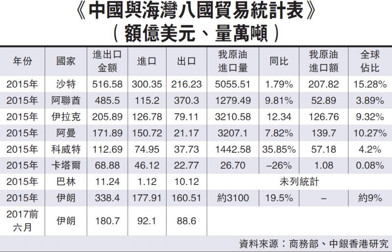 第一,中國與海灣國家在「貿易暢通」上取得顯著進展。其一,2015年7月伊朗與中、美、俄、英、法、德六國就限制伊朗發展核武及解除對伊制裁達成伊核全面協議,禁止外國與伊朗貿易往來的「次級制裁」自動解除,中伊經貿合作逐步恢復正常。其二,解讀《中國與海灣八國貿易統計表》(見表)可見,2015年雙邊貿易額已高達1911.07億美元。貿易量特別是原油貿易量有較大升幅。擴大原油貿易的動力由單向轉向雙向。既有中國擴大進口的動力,也有海灣國家因2014年國際油價暴跌並進入低油價時代,向東尋找亞洲石油市場的壓力。目前中國從海灣國家原油進口額在中國全球原油進口額中的佔比超過50%。其三,今年貿易回暖,今年前6個月中國與伊朗的貿易額達180.7億美元,同比增長30.8%。