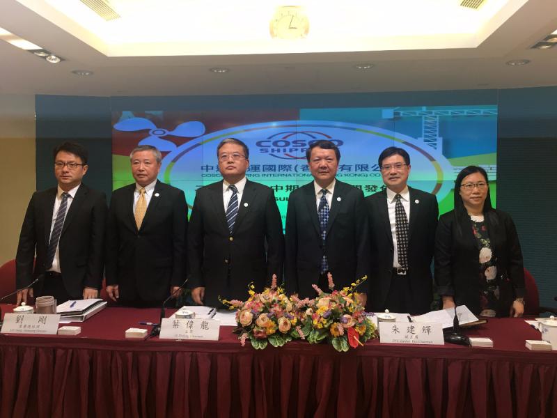 中遠海運國際財務總監陳偉銓(左起)、董事總經理劉剛、主席葉偉龍、副主席朱建輝、副總經理林文進、公司秘書招瑞雪(記者林靜文攝