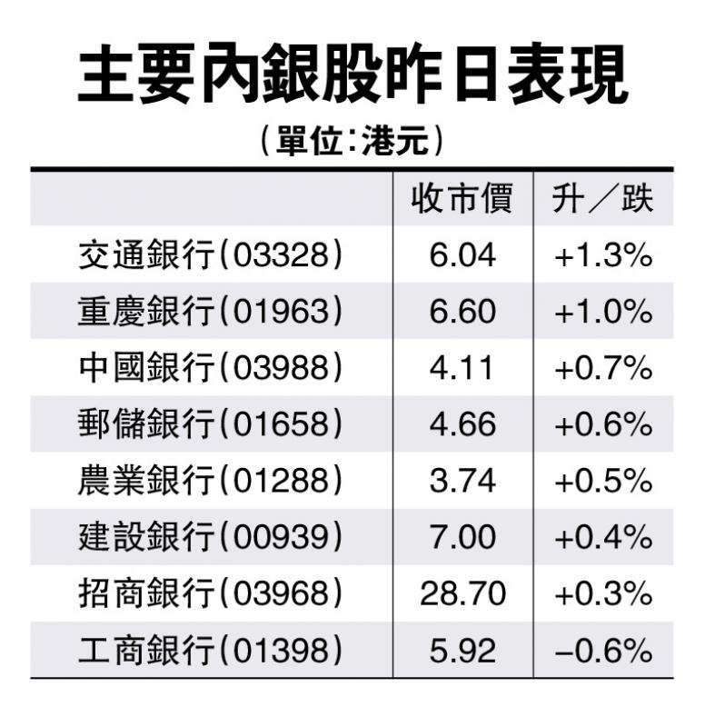 【大公報訊】記者劉鑛豪報道:承接上周五升勢,港股昨日一躍衝破二萬八,但基金趁高出貨,令到恒指曾經由升轉跌42點,收市幸保不失,微升15點,創27個月高位。內銀股是主要基金減持重災區,工行(01398)股價曾升穿6元關口,收市時倒跌0.6%;中行(03988)最多升2.4%,收市時升幅縮窄至0.7%。分析相信,大市升浪尚無跡象見頂,三大內銀股後市去向待業績公布後揭盅。