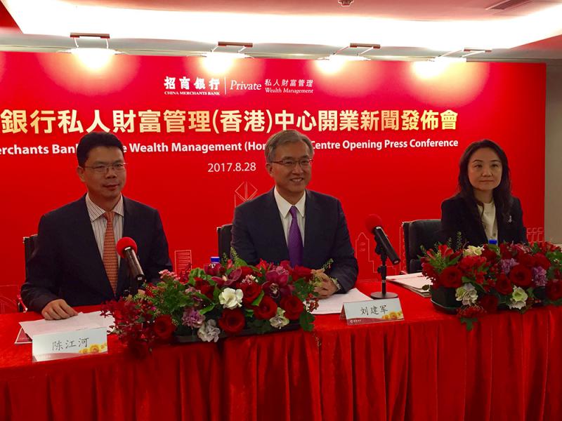 圖:左起:招商銀行香港分行行長陳江河、總行副行長劉建軍及私人銀行部總經理王菁\大公報記者邵淑芬攝