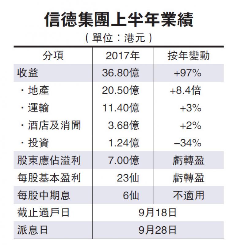 【大公報訊】記者李潔儀報道:受惠賣樓收益入帳大增刺激,信德集團(00242)上半年業績扭虧為盈,賺近七億港元,每股基本盈利23仙。董事會建議派發中期息每股6仙,行政主席兼董事總經理何超瓊按持股比例,可獲發股息約4400萬元。