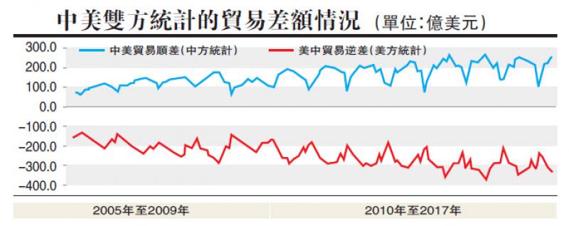 從兩國歷史數據看,伴隨着雙方國際貿易量的增長,中美兩國貿易失衡的狀況愈加嚴重。(見配圖)在規模上,2005年6月匯改前,中、美雙方統計的交易對方貿易差額分別為順差101.3億美元和逆差176.1億美元;2017年6月,上述差額分別增至順差254.0億美元和逆差325.8億美元。在比重上,美方數據顯示,美對華貿易逆差佔其總逆差的比重呈現整體增長的態勢,由2005年6月的30.2%上升至2017年6月底74.7%,增長超過一倍。
