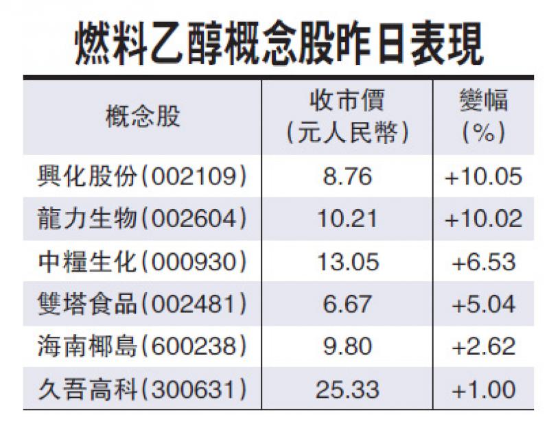 【大公報訊】記者李寅舟報道:車用乙醇汽油在汽油調合組分油中加入10%的變性燃料乙醇。分析表示,添加燃料乙醇的汽油,可有效減少汽車尾氣中的碳排放、PM2.5等細顆粒物排放以及其他有毒物質的污染,從而改善空氣品質。然而亦有分析指出,乙醇汽油畢竟絕大比例是普通汽油,「只是一定程度上減少污染物的排放,離未來的新能源還是有很大差距」。燃料和乙醇相關概念股昨日全線大漲,興化股份與龍力生物漲停,中糧生化漲6.53%,雙塔食品漲5.04%,海南椰島漲2.62%,久吾高科漲1%。