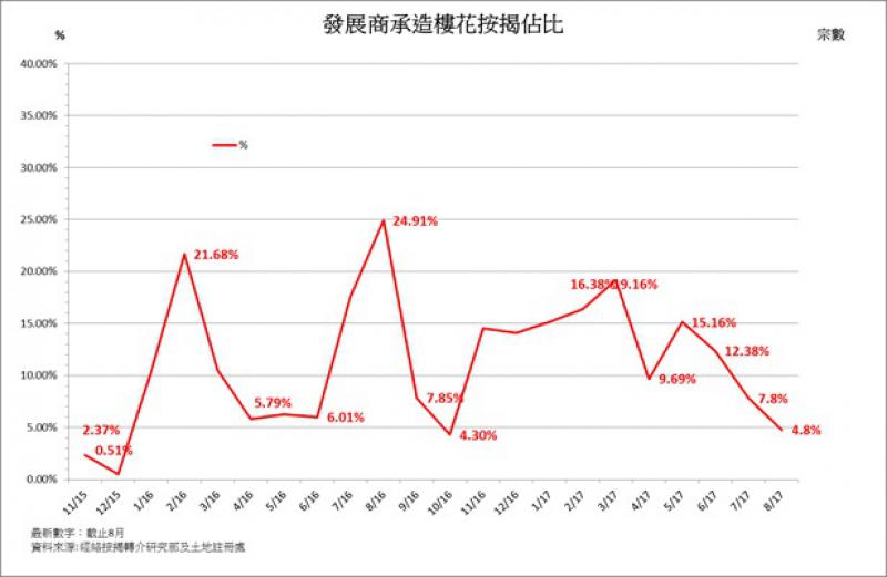 大公網9月14日訊 (記者黃裕慶報道) 一手樓受追捧之下,近期再有發展商推出高成數按揭協助準買家「上車」。根據經絡按揭轉介研究部統計,截至今年8月底,發展商承造的樓花按揭佔比已經下跌至4.8%,反映使用高成數按揭的買家仍為少數。