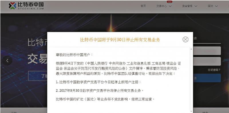 圖:比特幣中國昨晚在網上發聲明,正式宣布數字資產交易平台將在九月三十日停止所有交易業務 網絡圖片