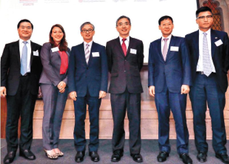 圖:左起:數碼港主席林家禮、倫敦金融城亞洲特別顧問Sherry Madera、創新及科技局副局長鍾偉強、財經事務及庫務局局長劉怡翔、金融局助理總裁李樹培及香港資訊科技聯會會長邱達根在歡迎晚宴合照 金管局提供圖片