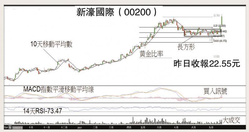 在日線圖上察看,新濠國際(00200)股價於七月中跌到黃金比率0.5後,已完成調整,並且在9月18日有大成交配合下,突破了圖表分析的長方形後,動力得到增強;另MACD指數平滑移動平均線也呈現買入訊號;只是14天RSI略為稍高73.47。