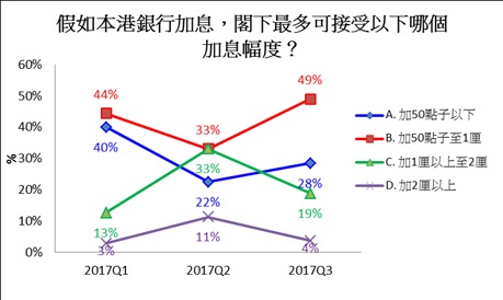 值得留意,如本港銀行未來加息,有154名、即28%被訪者認為加幅在半厘以下已經有影響,按季增加6個百分點,而認為加幅介乎半厘至1厘可以接受的,不但佔比最重,達49%,而且按季增加16個百分點;此外,只有19%可承受加息1至2厘,按季下跌14個百分點;其餘可接受加息2厘以上的僅得4%,換言之,整體抵禦加息能力下降。現時只有23%被訪者可接受加息1厘以上,比例按季大幅下跌21個百分點。