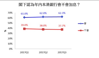 是次調查以問卷形式進行,共有541名市民接受訪問。調查發現,約337名被訪者認為今年內本港銀行將會提高按揭息率,佔比62.3%,比重與今年第一及第二季本行進行同類型的調查相若,另外204名、即約37.7%被訪者相信今年內本港銀行將不會調高按息。