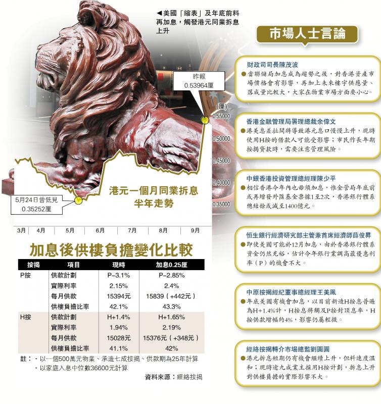 美聯儲落實「縮表」及年底前仍有加息機會,加上香港金管局宣布增發外匯基金票據等因素,持續推高短年期的港元同業拆息(Hibor),隔夜至1個月拆息同時升至0.5厘以上,1個月Hibor再刷新自2月來高位。金管局署理總裁余偉文、財政司司長陳茂波呼籲市民審慎管理風險。市場人士預期港元拆息短期內仍有上升壓力,年底前H按或觸及封頂息率,惟最優惠利率(P)變動機會不大。