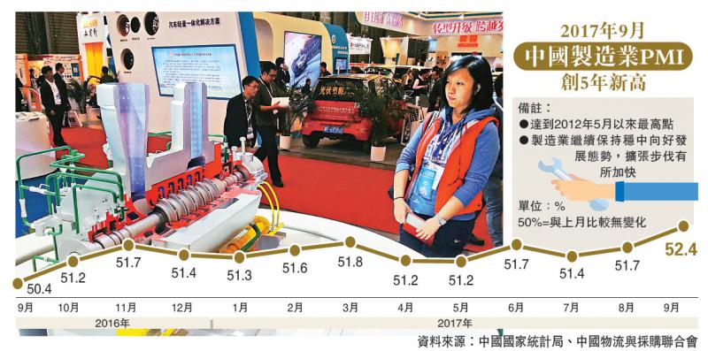 圖:九月官方製造業PMI升見52.4%,錄得2012年5月來新高,表明經濟增長趨穩的大勢比較明確,經濟平穩增長的特徵開始形成 大公報記者倪巍晨攝