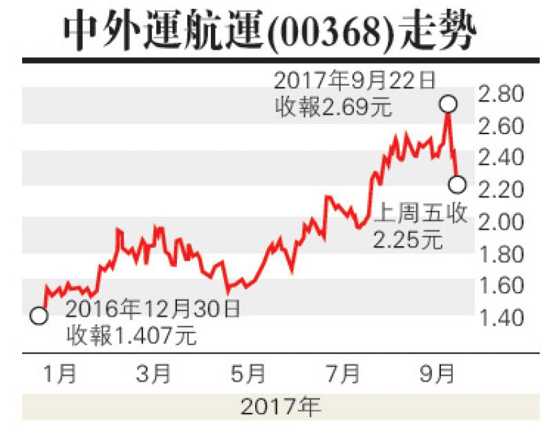 至於中外運航運的同系姊妹公司中國外運(00598),該公司早前向母公司收購招商局物流,若後者今明兩年的純利低於5.6億元人民幣和5.8億元人民幣將可獲補償。中金公司的研究報告指出,上述盈利保證能強化中外運利潤,降低不明朗因素,而收購後的協同效應亦將於長遠體現。維持「買入」評級,目標價看5.26元。