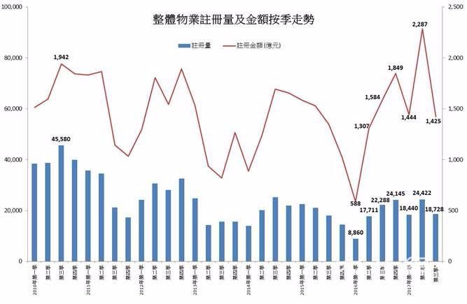 二手住宅市場方面,因政府進一步收緊按揭成數,以及一手新盤積極搶客下,二手交投疏落,最終拖累二手住宅按季註冊量繼去年首季後,再度跌穿萬宗水平,本季至今只錄8,849宗註冊,較次季的13,230宗下跌約33.1%,宗數創六個季度新低。涉及註冊金額約608.6億元,較次季約917.8億元下跌約33.7%。至於非住宅物業市場方面,本季至今錄得5,114宗註冊,較次季的4,810宗增加約6.3%,表現優於大市。