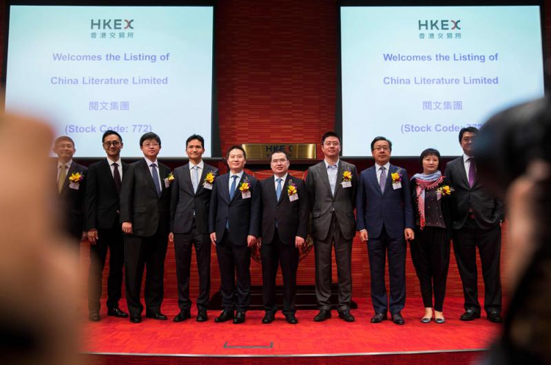 昨日舉行的上市儀式上,港交所代表向梁曉東送上金牛銅像,閱文則回贈寫有「賞心閱目」的牌匾。雖然閱文「親父」、騰訊馬化騰未有現身上市儀式,但騰訊亦派出一行約20人的代表出席,足見母企對親生仔上市相當上心。