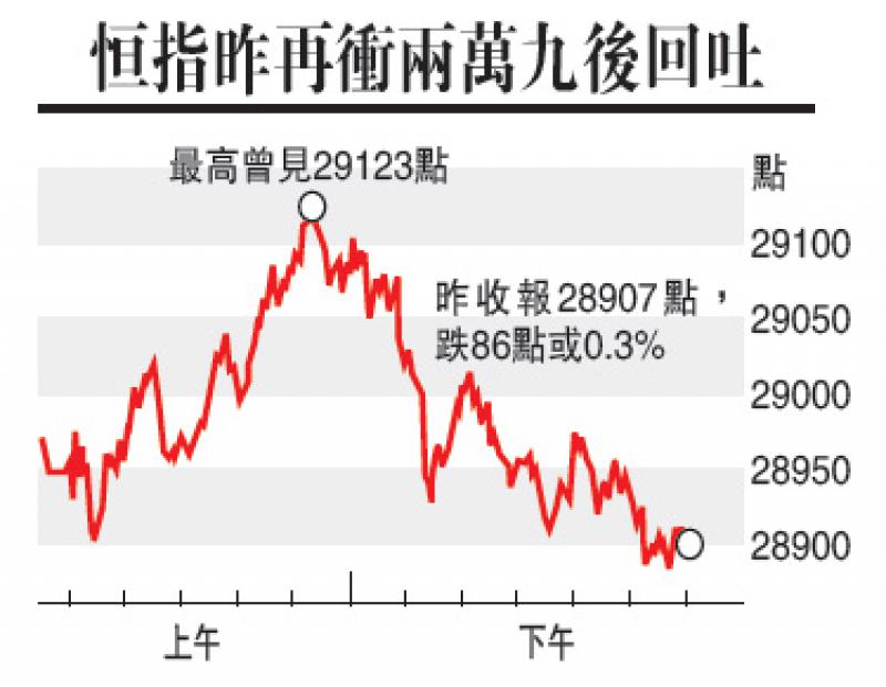 騰訊昨日低開後股價倒升,臨近中午曾迫近400元大關,創398.6元新高。但騰訊股價破頂後卻倒跌,加上內房及資源股板塊突然轉弱等不利因素拖累,港股最終要跌86點至28907點,國指則跌69點報11576點。大市成交大增至1387.8億元。滬、深港股南下交易淨流入金額分別為29.45億及12.78億元人民幣。港交所(00388)季績理想,股價曾一度高見235元,但之後亦倒跌,最終收報227元,跌1.4元或0.6%。