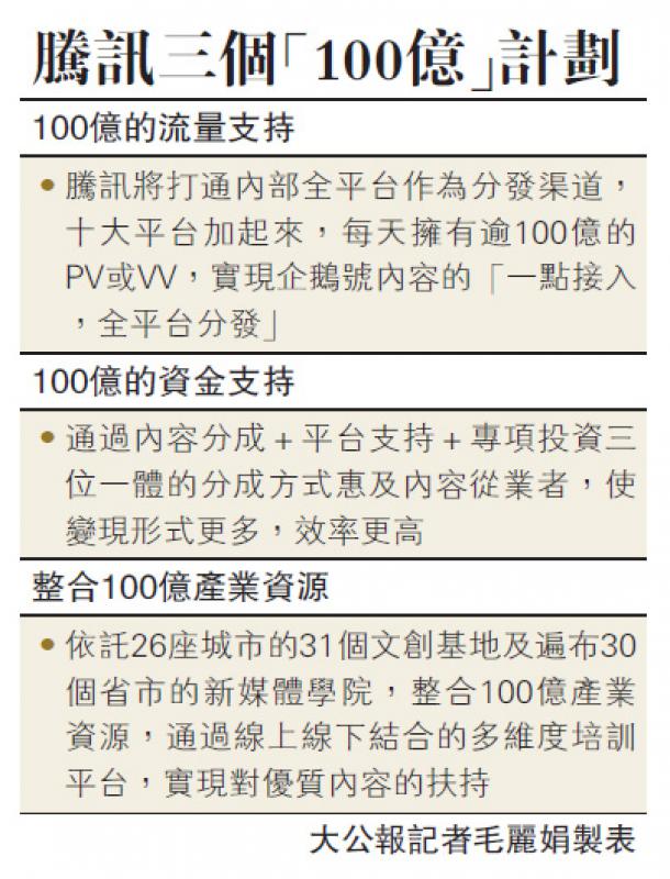 大會宣布正式推出騰訊內容開放平台,幫助內容創業者實現「一點接入、全網接通」的目標。同時,全新推出的「百億」計劃,將以100億流量、100億資金和100億產業資源,在流量和變現、投資孵化、線下文創基地等領域全面扶植內容創業者。
