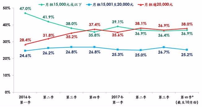 另一方面,過去半年多以來,月租15,000元或以下的住宅租務個案比率走勢平穩。據該公司促成的租務個案分析,月租15,000元或以下的住宅租務個案比率於第二季至本季(截至10月份)於36.4%至36.9%水平徘徊。至於月租15,001元至20,000元及逾20,000元的住宅租務個案比率則相對反覆,前者由第三季26.7%回落至10月份25.2%,重返第二季水平;後者則回升至38%,同樣重回次季水平。